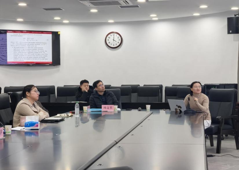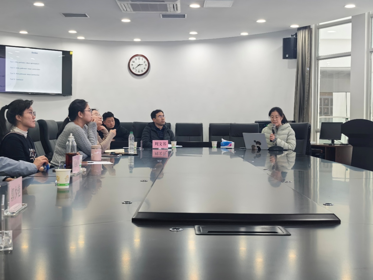 大连理工大学数学科学学院郭少艳教授《偏好鲁棒优化(Preference Robust Optimization)》为题,从偏好鲁棒优化(PRO)的背景引入,说明其聚焦决策者偏好不明确的决策问题,核心是基于现有信息构建集合、以“最坏情况”下的效用/风险测度确定最优决策。郭教授重点梳理了PRO的模型框架、计算方案与理论基础,呈现优化领域前沿动态。报告的最后,师生们围绕PRO的实际应用场景等问题进行了交流讨论。此次报告通过前沿内容分享与互动,拓宽了师生科研视野。